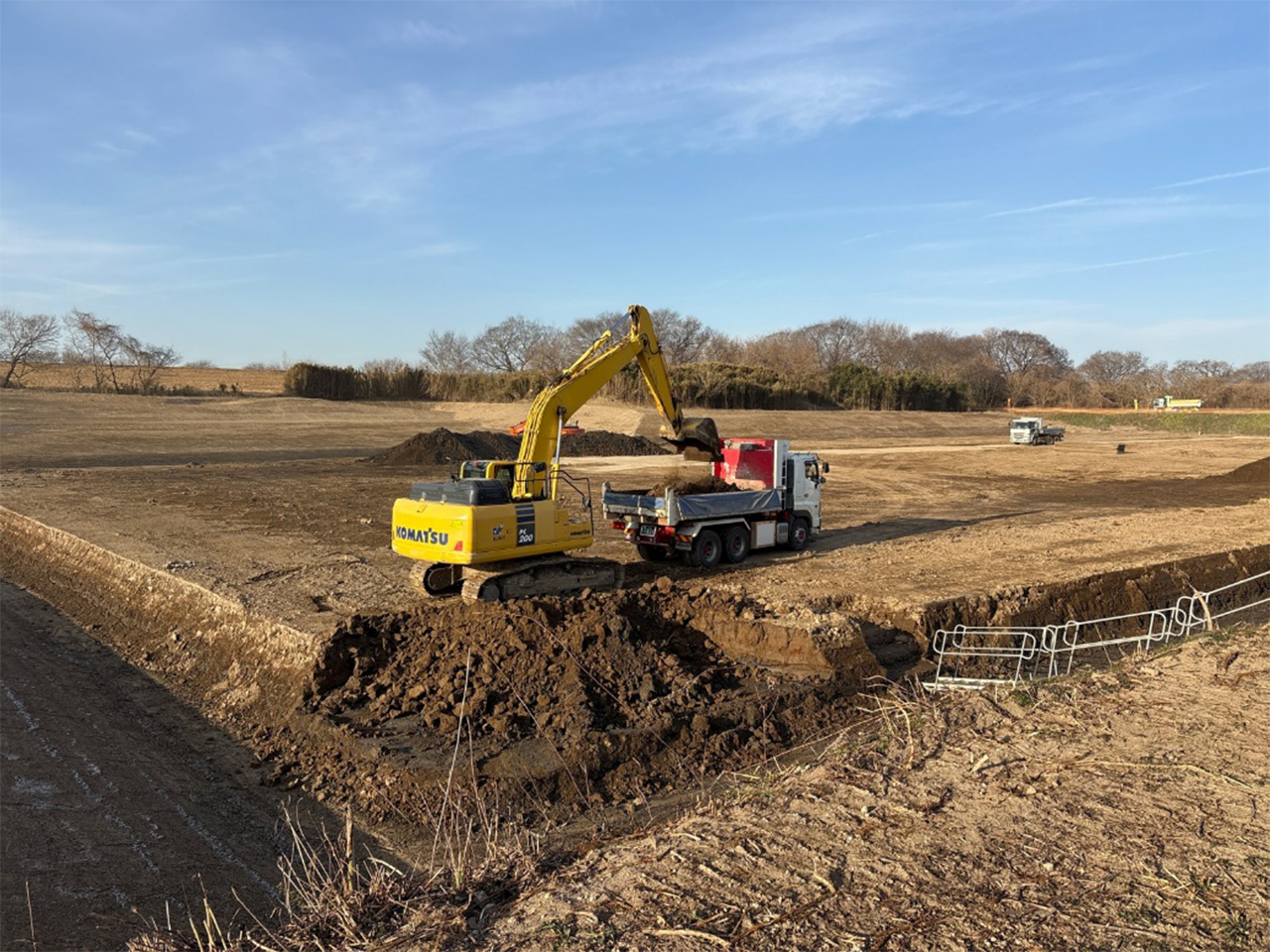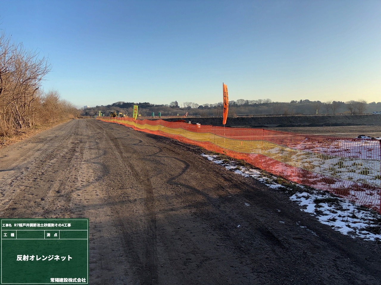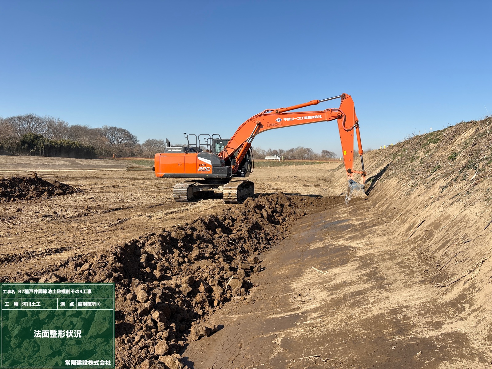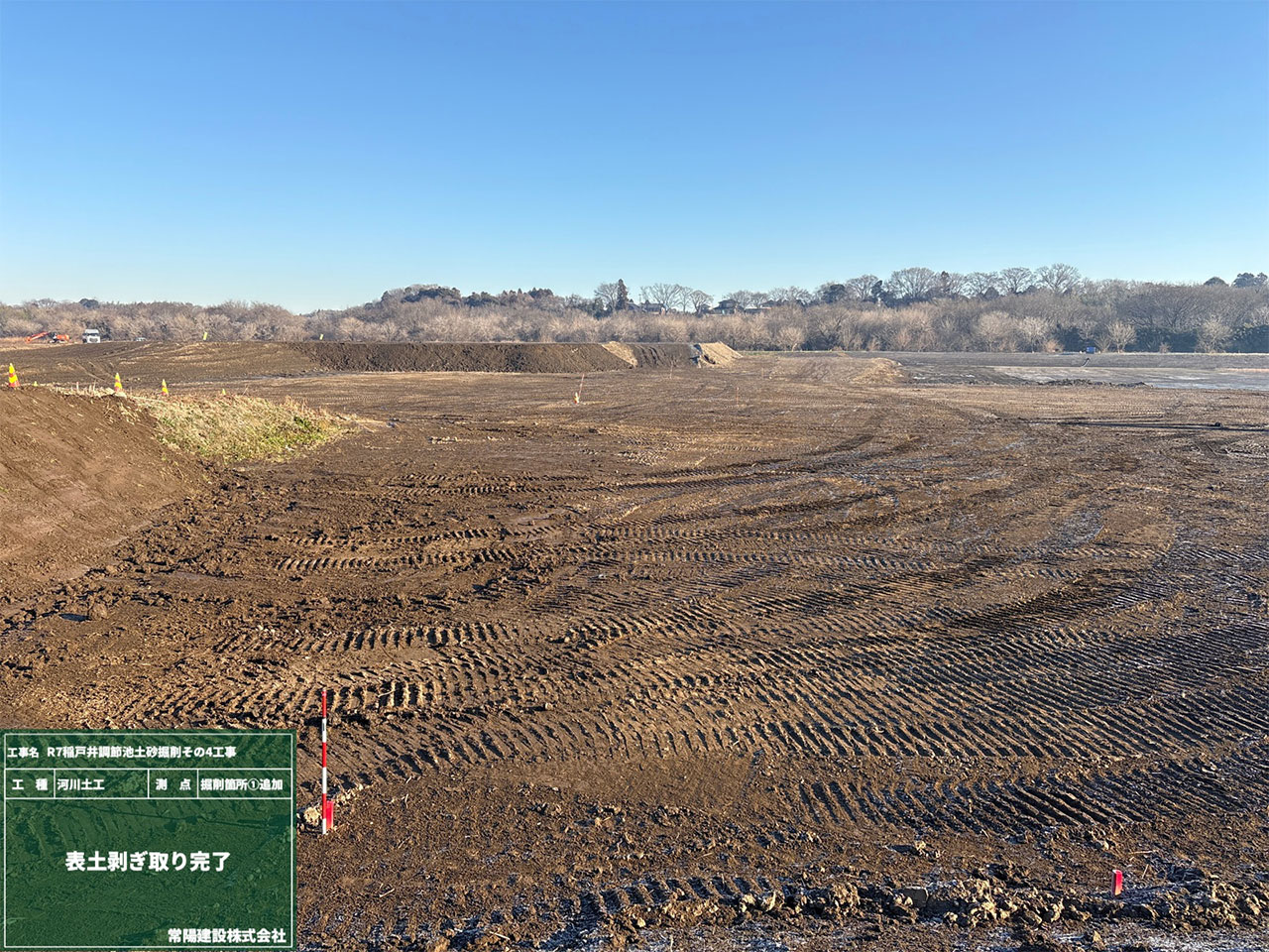 本工事では、水災害を防ぐために調整池の掘削を行い、これまで以上に洪水リスクを低減することを目的としています。