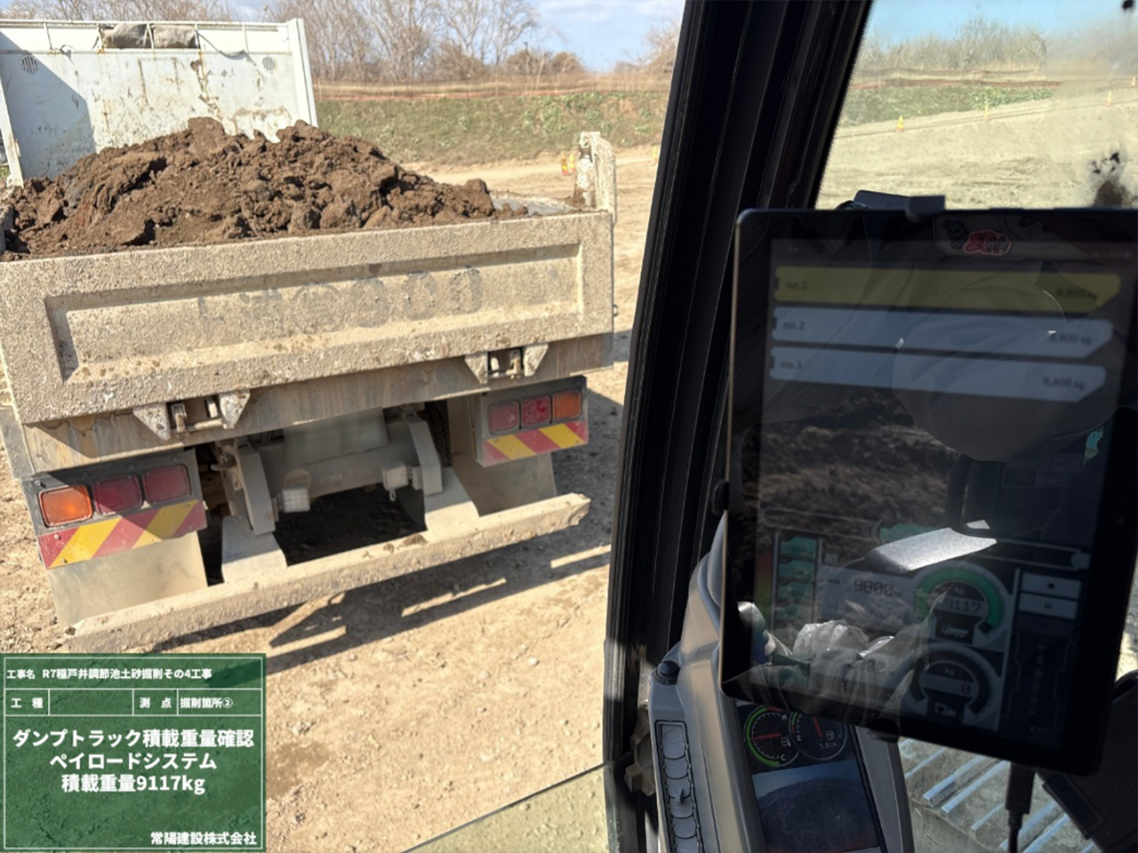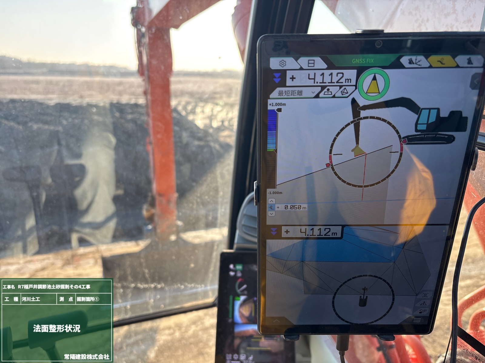 1枚目の写真は、3D設計データ&ショベルの刃先位置がリアルタイムでモニターに表示されています。