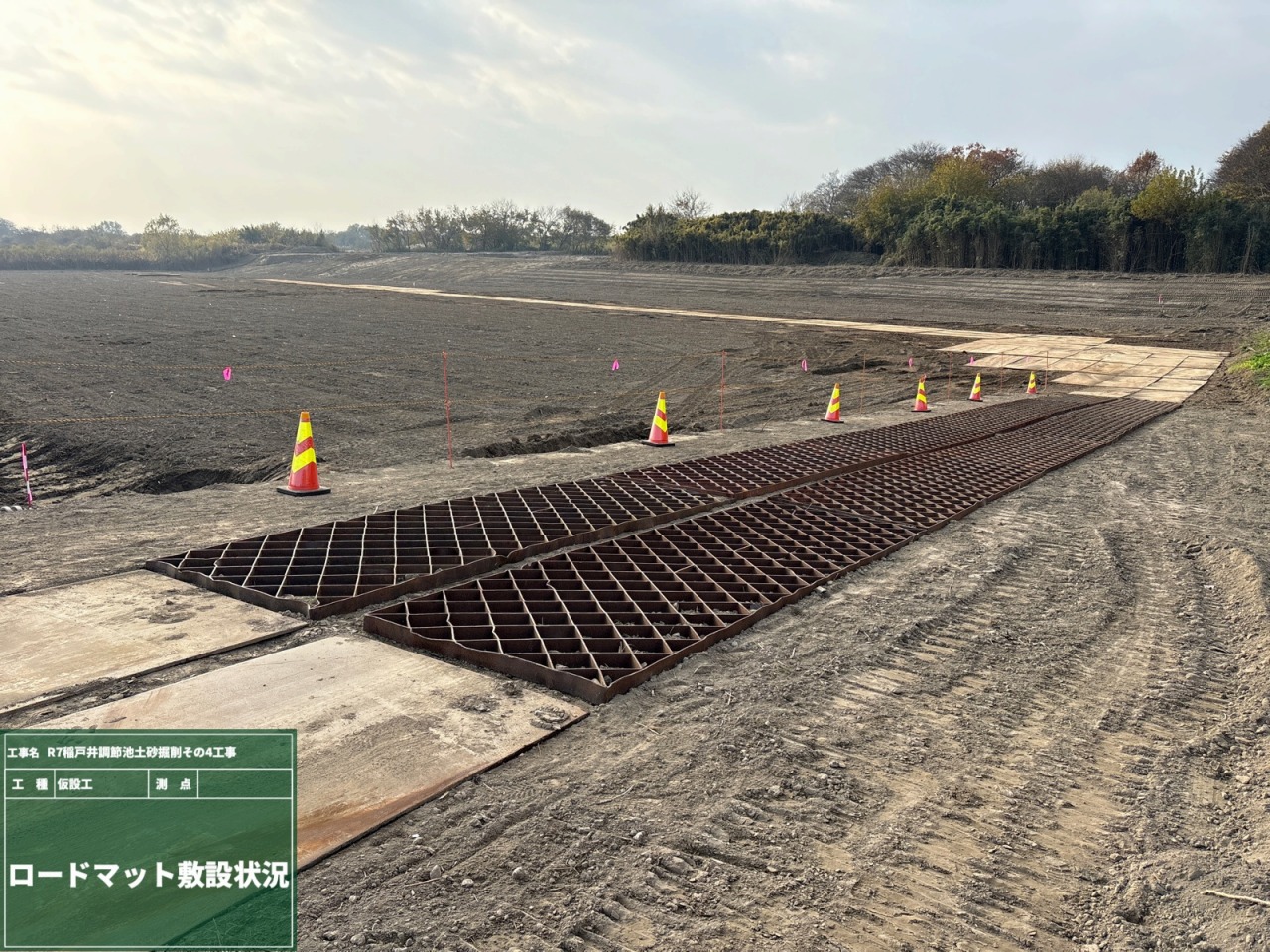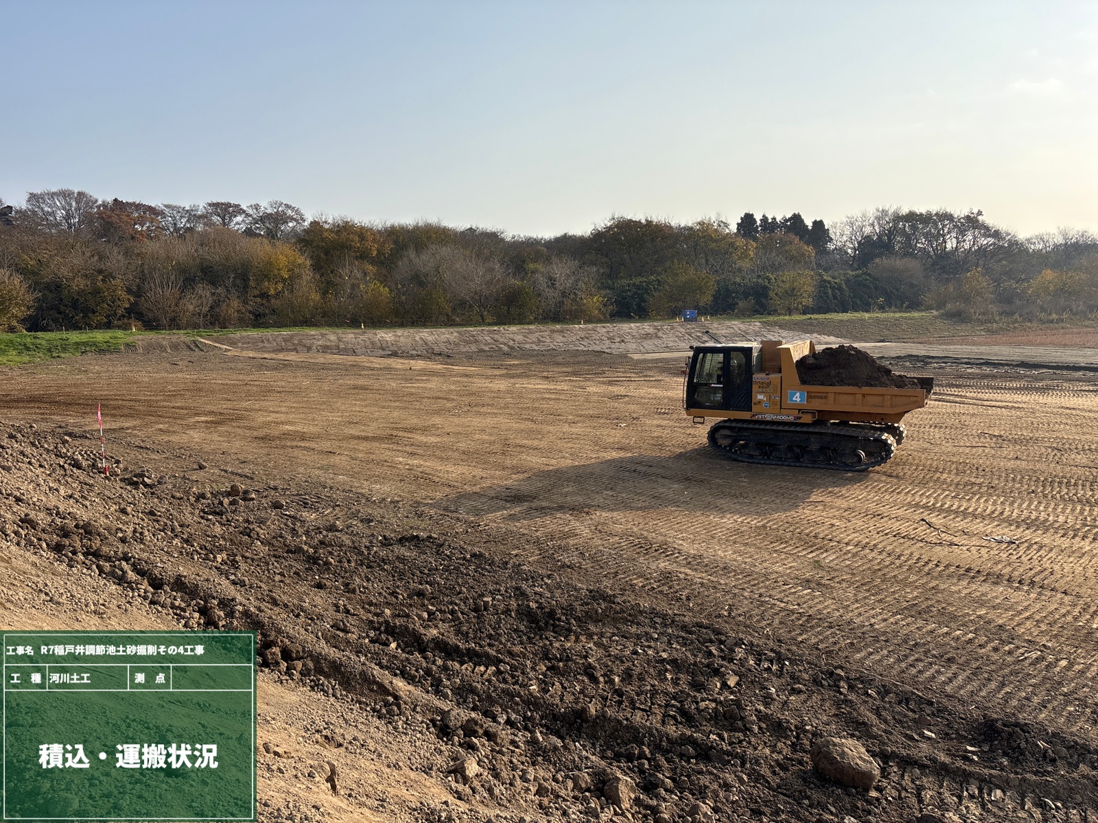 本工事では、水災害を防ぐために調整池の掘削を行い、これまで以上に洪水リスクを低減することを目的としています。